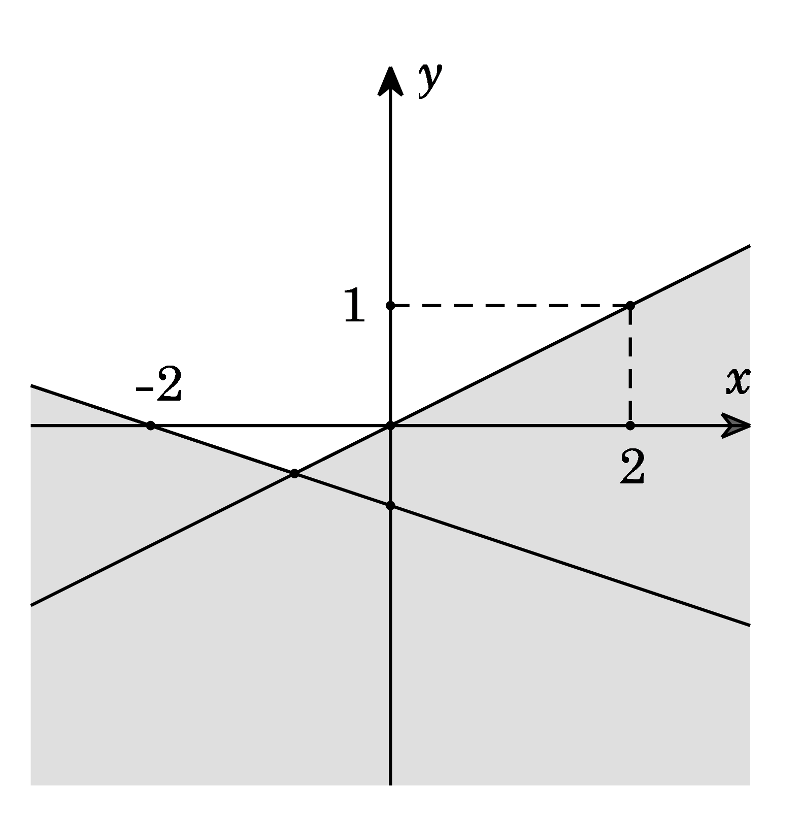 A. \(\left\{ \begin{array}{l}x – 2y \le 0\\x + 3y \ge  – 2\end{array} \right..\)             B. \(\left\{ \begin{array}{l}x – 2y > 0\\x + 3y <  – 2\end{array} \right..\)         C. \(\left\{ \begin{array}{l}x – 2y \le 0\\x + 3y \le  – 2\end{array} \right..\)                    D. \(\left\{ \begin{array}{l}x – 2y < 0\\x + 3y >  – 2\end{array} \right..\)