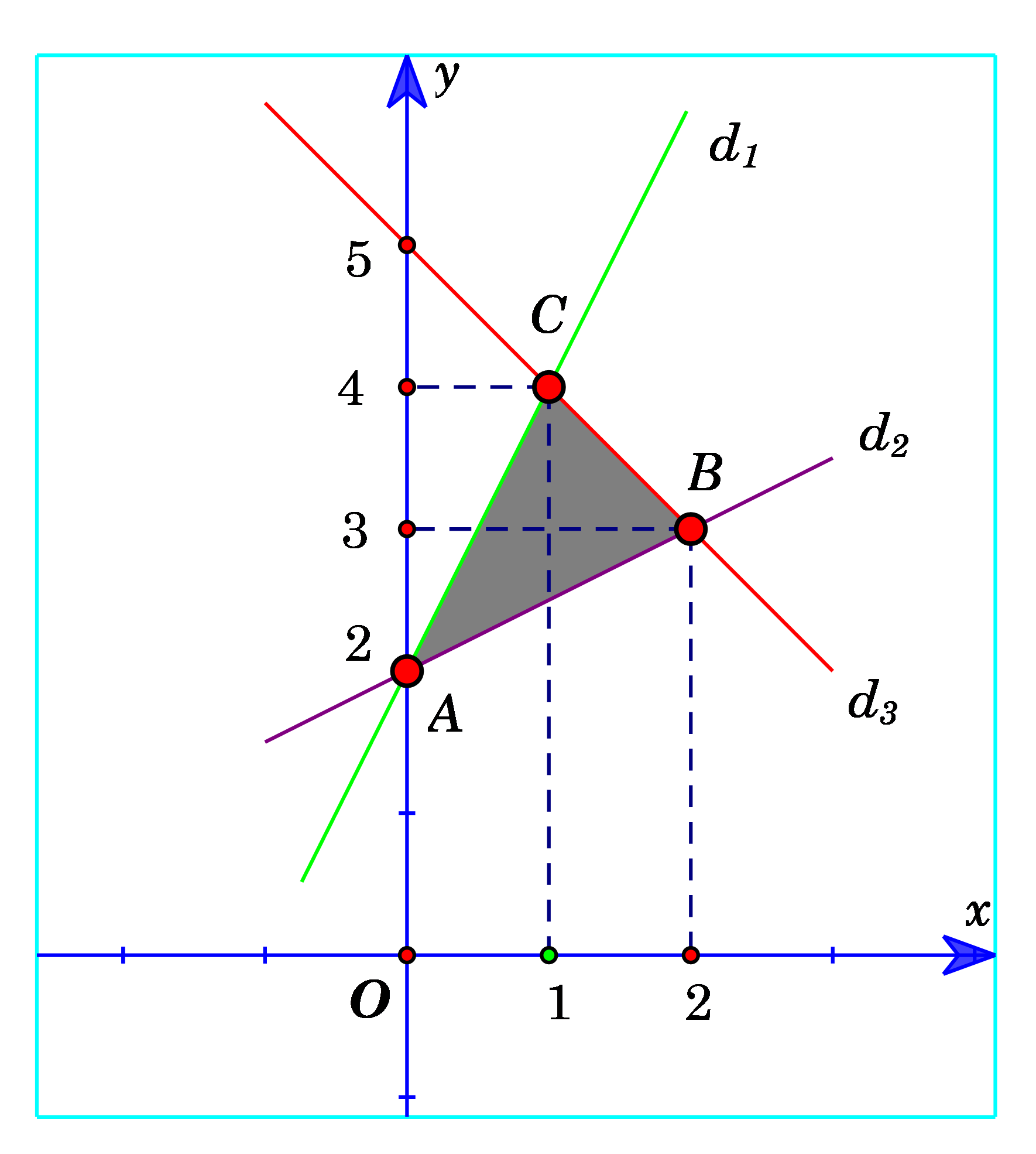 \(\begin{array}{l}{d_1}:y – 2x – 2 = 0,\,\,{\rm{  }}{d_2}:2y – x – 4 = 0,{\rm{  }}\\{\rm{ }}{d_3}:x + y – 5 = 0.\end{array}\)