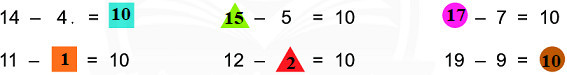Xem lại các phép tính có hiệu bằng 10 đã học rồi điền các số được che.