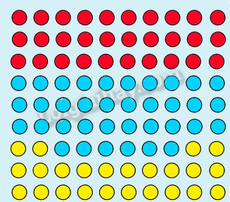 Vậy ta sẽ tô màu \(30\) chấm tròn màu đỏ, \(36\) chấm tròn màu xanh và \(24\) chấm tròn màu vàng.