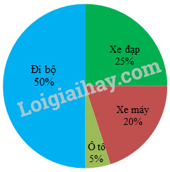 – Từ biểu đồ ta thấy có 50% số học sinh đi bộ đế đến trường, 25% số học sinh đi xe đạp để đến trường, 20% số học sinh được bố mẹ chở bằng xe máy đến trường và 5% số học sinh được đưa đến trường bằng ô tô. Từ đó ta tìm được số học sinh sử dụng các loại phương tiện để đến trường.