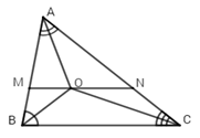 Cho \(\Delta ABC\), các tia phân giác của góc $B$  và $A$ cắt nhau tại điểm $O.$  Qua $O$  kẻ đường thẳng song song với $BC$  cắt $AB$  tại $M,$ cắt $AC$  ở $N.$  Cho $BM = 2cm,CN = 3cm.$ Tính $MN?$