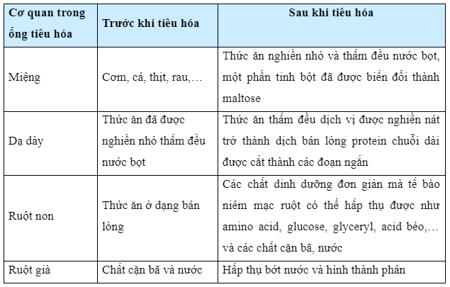 Dựa vào những hiểu biết của em về sự biến đổi thức ăn trong ống tiêu hóa của người, hãy hoàn thành bảng theo mẫu sau và rút ra nhận xét về sự phối hợp hoạt động của các cơ quan trong ống tiêu hóa.