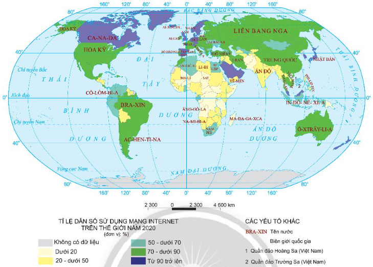 – Nhận xét tỉ lệ dân số sử dụng internet so với tổng dân số ở các quốc gia trên thế giới năm 2020.