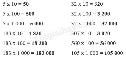 – Áp dụng cách tính: Khi nhân một số với 10, 100, 1000, … ta chỉ việc viết thêm một, hai, ba, … chữ số 0 vào bên phải số đó.