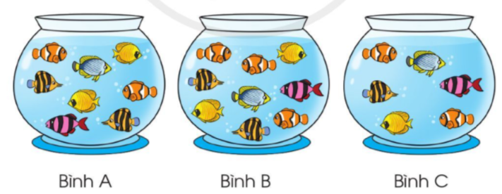 Đếm số cá ở mỗi bình rồi nêu ý nghĩa của mỗi biểu thức.
