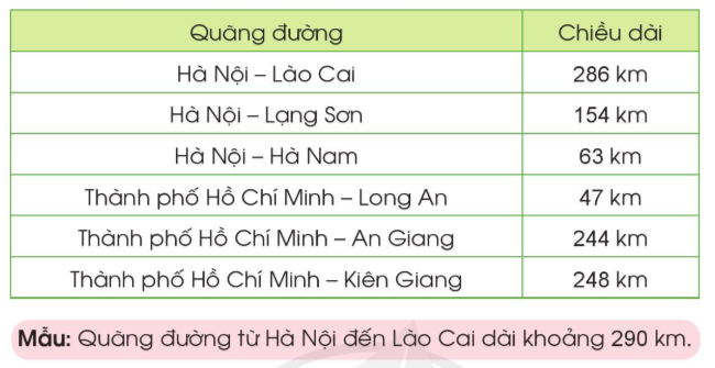 Em quan sát thông tin trong bảng rồi làm tròn độ dài mỗi quãng đường trên đến hàng chục.