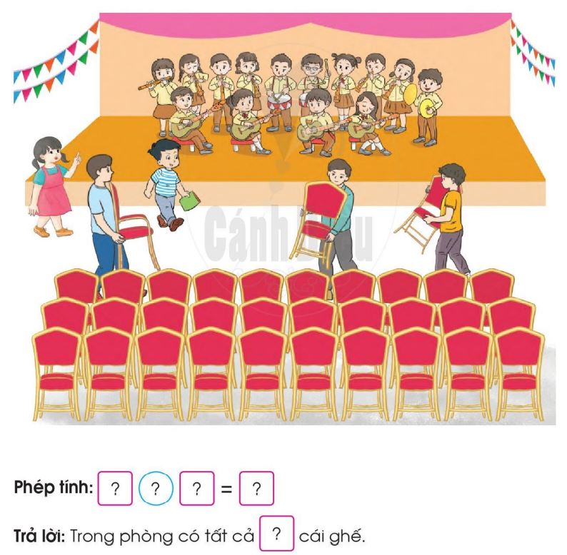 Muốn tính tổng số ghế trong phòng ta lấy số ghế ban đầu có trong phòng cộng với số ghế được mang thêm vào.