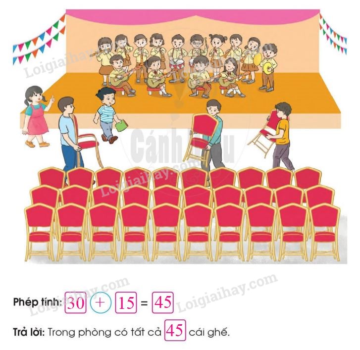 Trong phòng có 30 cái ghế, người ta mang thêm vào 15 cái ghế nữa. Hỏi trong phòng có tất cả bao nhiêu cái ghế?
