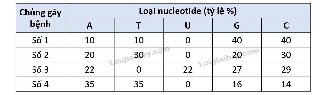 Câu 12. Phân tích vật chất di truyền của 4 chủng gây bệnh thì thu được kết quả như sau: