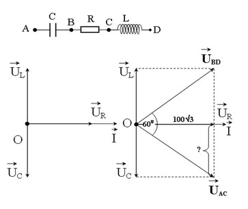 Trên đoạn mạch xoay chiều không phân nhánh có bốn điểm theo đúng thứ tự A, B, C và D. Giữa hai điểm A và B chỉ có tụ điện, giữa hai điểm B và C chỉ có điện trở thuần, giữa 2 điểm C và D chỉ có cuộn cảm thuần cảm. Điện áp hiệu dụng giữa hai điểm A và D là \(100\sqrt 3 V\) và cường độ hiệu dụng chạy qua mạch là 1 (A). Điện áp tức thời trên đoạn AC và trên đoạn BD lệch pha nhau 600 và giá trị hiệu dụng bằng nhau. Dung kháng của tụ điện là: