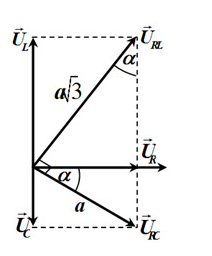 \(\begin{array}{l}\tan \alpha  = \dfrac{{{U_{RC}}}}{{{U_{RL}}}} = \dfrac{a}{{a\sqrt 3 }} = \dfrac{1}{{\sqrt 3 }} \to \alpha  = {30^0}\\\left\{ \begin{array}{l}{U_R} = ac{\rm{os}}\alpha  = \dfrac{{a\sqrt 3 }}{2}\\{U_C}{\rm{ =  asin}}\alpha  = \dfrac{a}{2}\\{U_L} = a\sqrt 3 {\rm{cos}}\alpha  = \dfrac{{3a}}{2}\end{array} \right. \\\to c{\rm{os}}\varphi {\rm{ = }}\dfrac{{{U_R}}}{U} = \dfrac{{{U_R}}}{{\sqrt {{U_R}^2 + {{\left( {{U_L} – {U_C}} \right)}^2}} }} = \sqrt {\dfrac{3}{7}} \end{array}\)