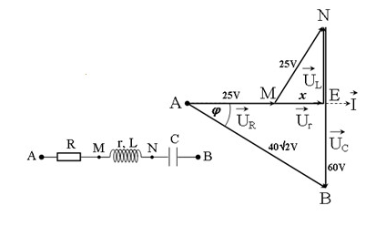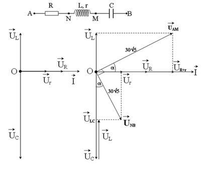 \(\begin{array}{l}\left\{ \begin{array}{l}\sin \alpha  = \dfrac{{{U_r}}}{{{U_{NB}}}} = \dfrac{{{U_r}}}{{30\sqrt 5 }}\\{\rm{cos}}\alpha {\rm{ = }}\dfrac{{{U_{R + r}}}}{{{U_{AM}}}} = \dfrac{{2{U_r}}}{{30\sqrt 5 }}\end{array} \right. \to \tan \alpha  = \dfrac{1}{2} \to c{\rm{os}}\alpha {\rm{ = }}\dfrac{2}{{\sqrt 5 }}\\ \to \left\{ \begin{array}{l}{U_{R + r}} = 30\sqrt 5 {\rm{cos}}\alpha  = {\rm{60V}}\\{U_{LC}} = 30\sqrt 5 {\rm{cos}}\alpha  = {\rm{60V}}\end{array} \right.\\ \to U = \sqrt {{U_{R + r}}^2 + {U_{LC}}^2}  = 60\sqrt 2 V\end{array}\)
