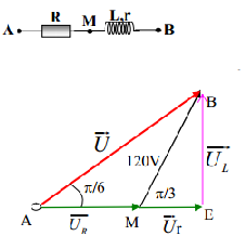 $\dfrac{{{U_R}}}{{\sin \angle ABM}} = \dfrac{{{U_{AB}}}}{{\sin \angle AMB}} \leftrightarrow \dfrac{{{U_R}}}{{\sin \dfrac{\pi }{6}}} = \dfrac{{{U_{AB}}}}{{\sin \dfrac{{2\pi }}{3}}} \to {U_R} = \dfrac{{{U_{AB}}}}{{\sin \dfrac{{2\pi }}{3}}}\sin \dfrac{\pi }{6} = \dfrac{{240}}{{\dfrac{{\sqrt 3 }}{2}}}\dfrac{1}{2} = \dfrac{{240}}{{\sqrt 3 }} = 80\sqrt 3 V$