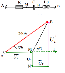 Trên đoạn mạch xoay chiều không phân nhánh có bốn điểm theo đúng thứ tự $A, M, N$ và $B$. Giữa hai điểm $A$ và $M$ chỉ có điện trở thuần, giữa hai điểm $M$ và $N$ chỉ có tụ điện, giữa hai điểm $N$ và $B$ có cuộn cảm. Đặt vào hai đầu đoạn mạch một điện áp xoay chiều $240V – 50Hz$ thì $u_{MB}$ và $u_{AM}$ lệch pha nhau \(\dfrac{\pi }{3}\), $u_{AB}$ và $u_{AM}$ lệch pha nhau \(\dfrac{\pi }{6}\) . Điện áp hiệu dụng trên $R$ là: