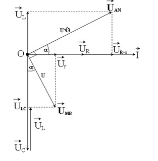 \(\left\{ \begin{array}{l}\sin \alpha  = \dfrac{{{U_r}}}{{{U_{MB}}}} = \dfrac{{{U_r}}}{U}\\{\rm{cos}}\alpha {\rm{ = }}\dfrac{{{U_{R + r}}}}{{{U_{AN}}}} = \dfrac{{{U_{R + r}}}}{{U\sqrt 3 }} = \dfrac{{3{U_r}}}{{U\sqrt 3 }}\end{array} \right. \to \tan \alpha  = \dfrac{{\sqrt 3 }}{3} \to \alpha  = {30^0}\)