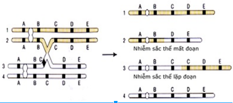 (1) Sự trao đổi chéo không cân giữa hai nhiễm sắc thể cùng cặp tương đồng dẫn đến hiện tượng lặp đoạn và mất đoạn nhiễm sắc thể.