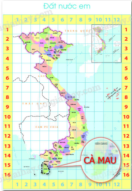 Tỉnh Cà Mau nằm ở phía dưới cùng ở bản đồ. Em quan sát kĩ bản đồ rồi tìm vị trí tỉnh Cà Mau.