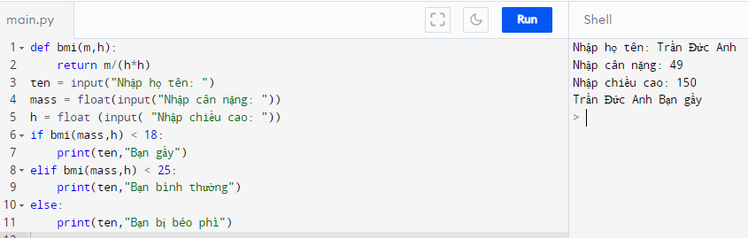 , trong đó m là khối lượng cơ thể tính bằng kg, h là chiều cao tính theo mét. Viết hàm số tính chỉ số BMI theo các tham số m, h.