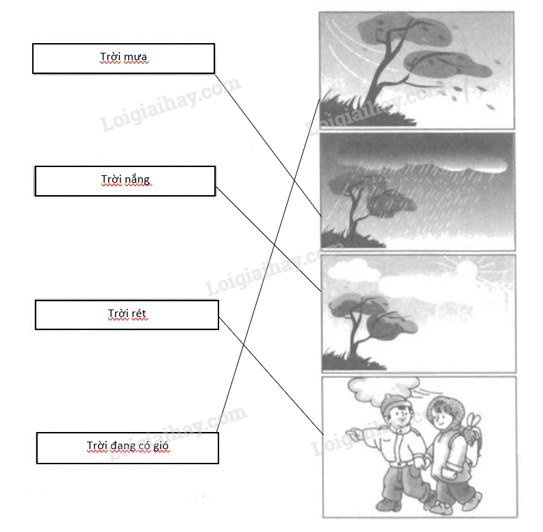 Em hãy quan sát các bức tranh và đặc điểm của mỗi bức tranh để xác định đâu là trời rét, trời nắng, trời mưa, trời đang có gió.