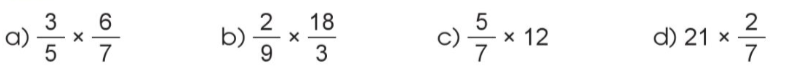 a)  $\frac{3}{5} \times \frac{6}{7} = \frac{{3 \times 6}}{{5 \times 7}} = \frac{{18}}{{35}}$