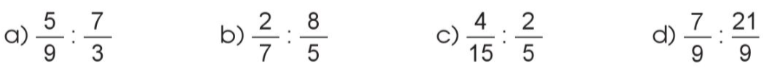 a) $\frac{5}{9}:\frac{7}{3} = \frac{5}{9} \times \frac{3}{7} = \frac{{15}}{{63}} = \frac{5}{{21}}$