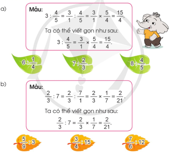 Muốn chia một phân số cho một phân số khác 0 ta lấy phân số thứ nhất nhân với phân số đảo ngược của phân số thứ hai.