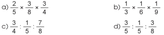 d) $\frac{3}{5}:\frac{1}{5}:\frac{3}{8} = \frac{3}{5} \times \frac{5}{1} \times \frac{8}{3} = \frac{{3 \times 5 \times 8}}{{5 \times 1 \times 3}} = 8$