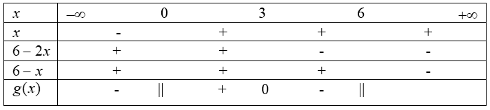 Đặt \(g(x)=\dfrac{{6 – 2x}}{{6x – {x^2}}} \Leftrightarrow g(x)=\dfrac{{6 – 2x}}{{x(6 – x)}}\).