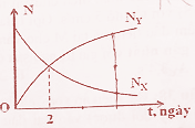 Từ đồ thị ta thấy tại \(t = 2\) ngày số hạt nhân X bằng số hạt nhân Y nên ta có