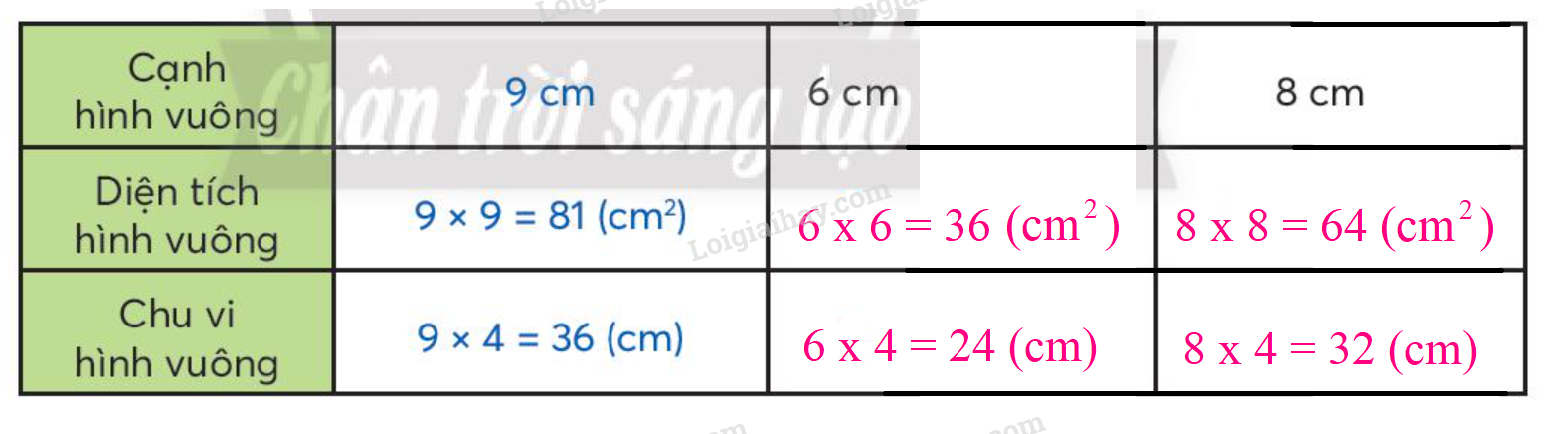 – Chu vi hình vuông = cạnh hình vuông nhân với 4.