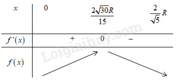 Từ BBT suy ra \(\mathop {\max }\limits_{\left( {0;\dfrac{{2R}}{{\sqrt 5 }}} \right]} f\left( x \right) = f\left( {\dfrac{{2\sqrt {30} R}}{{15}}} \right) \Leftrightarrow x = \dfrac{{2\sqrt {30} R}}{{15}}\).