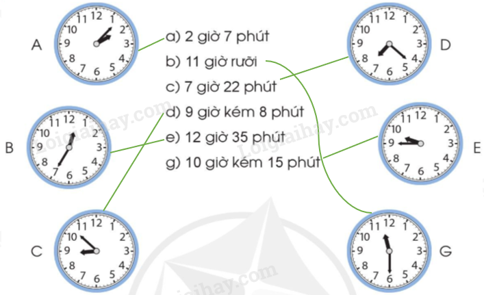 Xác định vị trí của kim giờ và kim phút trên mỗi đồng hồ rồi đọc giờ thích hợp.