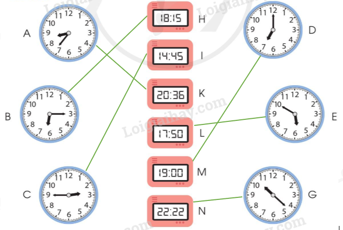 Xem đồng hồ rồi nối với đồng hồ điện tử chỉ cùng giờ vào buổi chiều hoặc buổi tối.