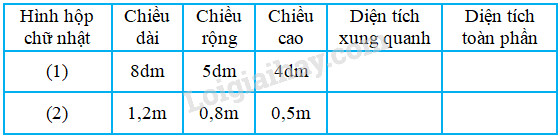 – Muốn tính diện tích toàn phần của hình hộp chữ nhật ta lấy diện tích xung quanh cộng với diện tích hai đáy.