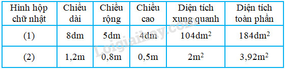 Giải bài tập 1, 2, 3 trang 23, 24 VBT toán 5 bài 105 : Diện tích xung quanh và diện tích toàn phần của hình hộp chữ nhật với lời giải chi tiết và cách giải nhanh, ngắn nhất