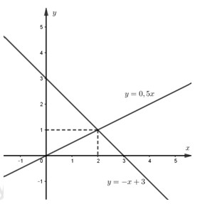 Cho hàm số \(y = 0,5x\) có đồ thị là \(\left( {{d_1}} \right)\) và hàm số \(y =  – x + 3\) có đồ thị là \(\left( {{d_2}} \right)\).