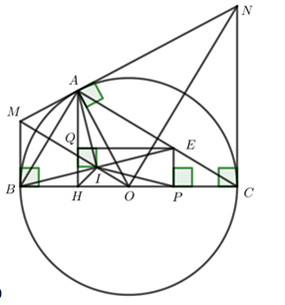 b) Tiếp tuyến tại A của \(\left( O \right)\) cắt các tiếp tuyến tại B và C lần lượt tại M và N. Chứng minh \(MN = MB + NC\) và \(\angle MON = {90^o}\)