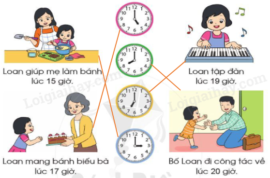 Quan sát tranh rồi nối đồng hồ với mỗi hoạt động cho thích hợp.