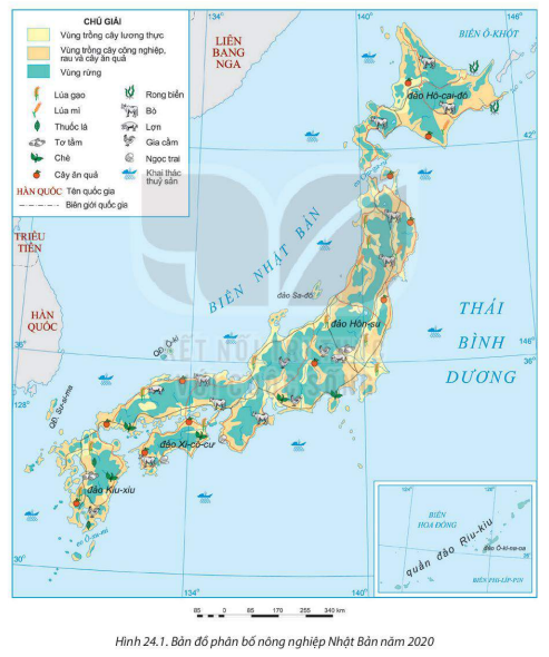 Dựa vào thông tin mục 1 và hình 24.1, hãy trình bày sự phát triển và phân bố của ngành nông – lâm – thuỷ sản của Nhật Bản.