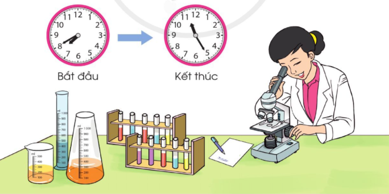 Xác định vị trí của kim giờ và kim phút trên mỗi đồng hồ rồi đọc giờ bắt đầu và giờ kết thúc.