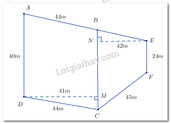 Để tính diện tích và chu vi mảnh đất có dạng như hình vẽ, người ta chia nó thành hình bình hành \(ABCD\) và hình thang cân \(BEFC\) có kích thước như sau: \(AD = 40m;EF = 24m;DC = 44m;DM = 41m;\) \(EN = 42m;\)\(CF = 45m\). Tính chu vi và diện tích mảnh đất này?