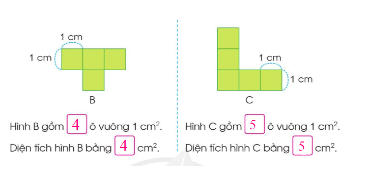 – Diện tích của mỗi hình bằng số ô vuông vừa đếm được.
