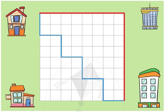 Quãng đường màu đỏ gồm 16 cạnh ô vuông nhỏ.