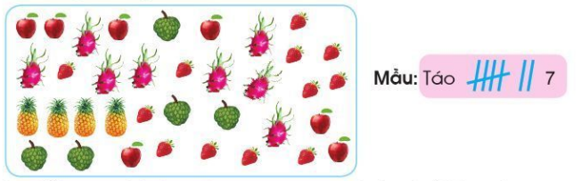 Quan sát tranh, em đếm số quả na, dâu tây, thanh long, dứa rồi ghi lại số lượng mỗi loại quả theo mẫu.