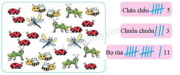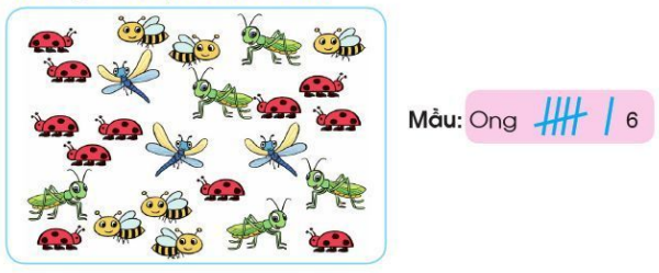 Quan sát tranh, em đếm số châu chấu, chuồn chuồn, bọ rùa rồi ghi lại số lượng mỗi con vật theo mẫu.