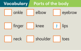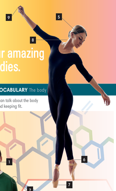 1. Match the words below with the parts of the body 1-9 in the photos. Listen and check.