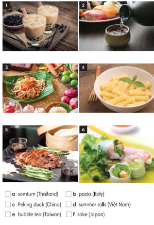(Ghép các ảnh (1-6) với tên đồ ăn và thức uống (a-f). Lắng nghe để kiểm tra câu trả lời của bạn.)