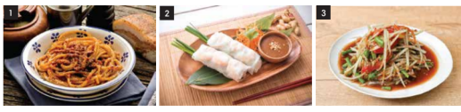 2. Listen to three people describing dishes from their countries. Match the speech of each person to a photo. Write the name of the food next to the photo.