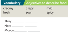 (Làm việc theo cặp. Học sinh A, chọn một món ăn yêu thích và mô tả nó cho Học sinh B. Học sinh B, đoán món ăn mà bạn nghe thấy. Sau đó đổi vai.)